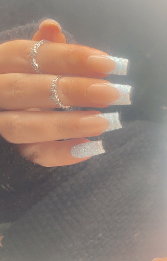 Classic white French tips with silver glitter on ring finger Ring 3