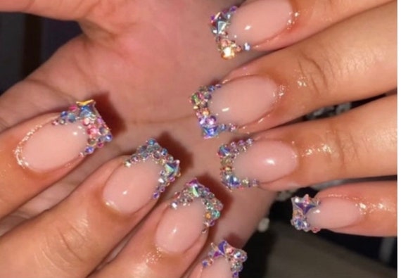 Diamond bling rhinestone french tip Bling nails Diamond nails Short 0