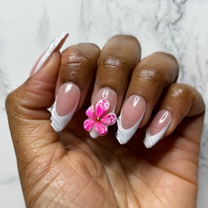 White French Tips W Acrylic 3D Flowers Press on Nails Etsy 4