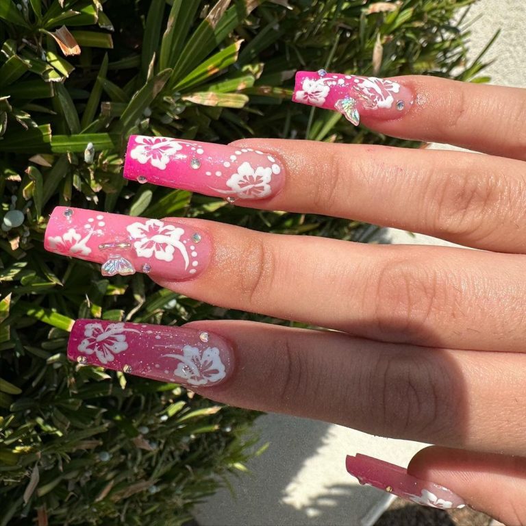 Pink and white hibiscus flower nail inspo Flower nails Pink acrylic 3