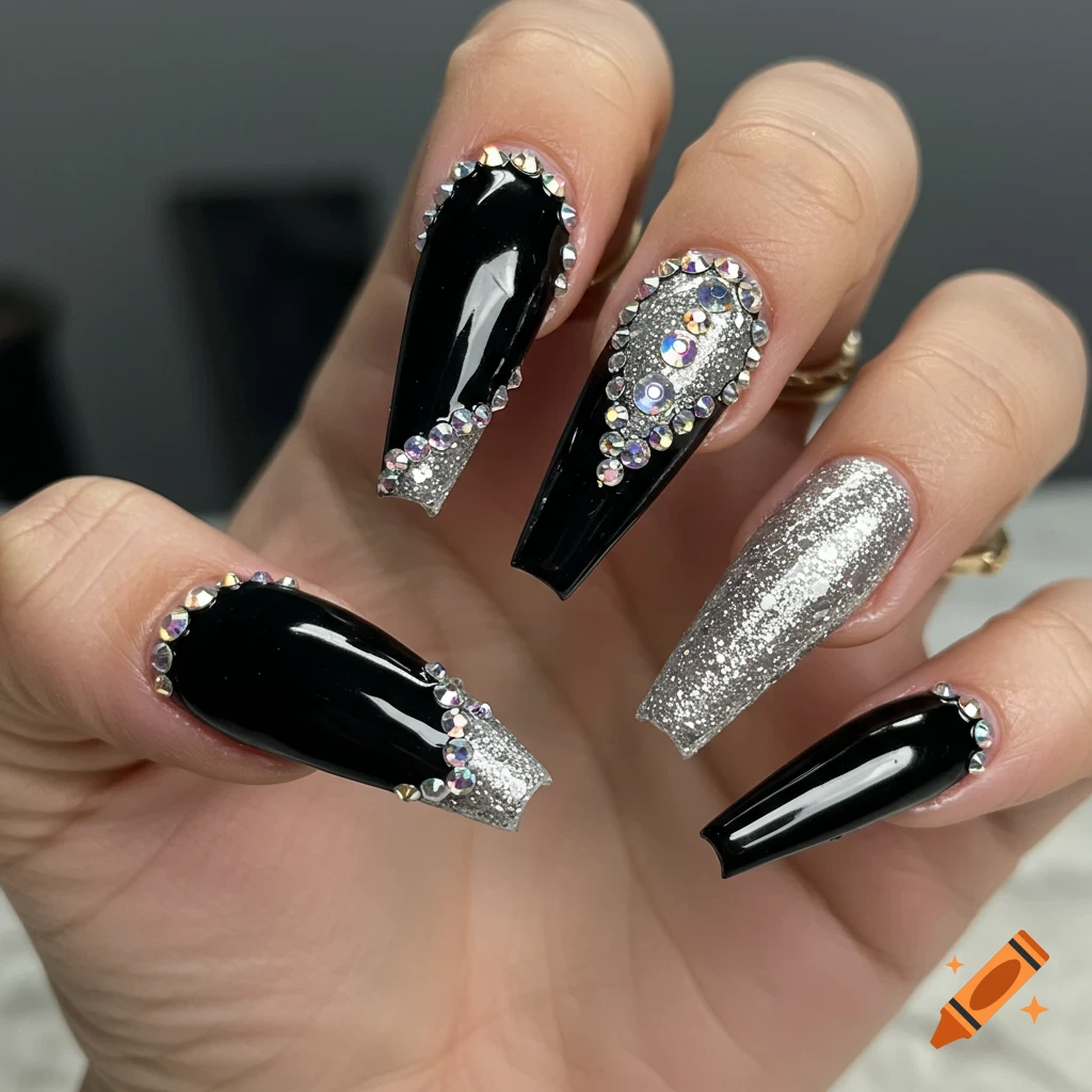 Rhinestone black stiletto French tips silver prom nails on Craiyon 11