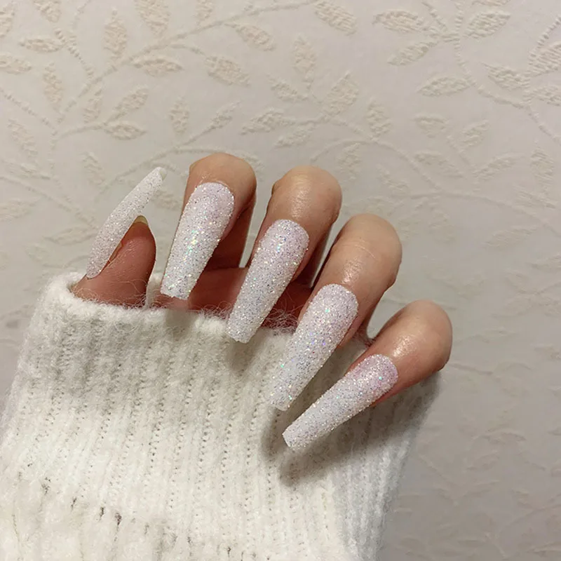 MISUD Glitter Long Coffin Fake Nails White Ballerina Shape Acrylic 1