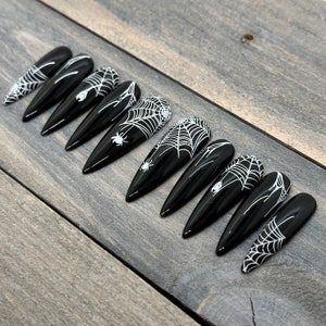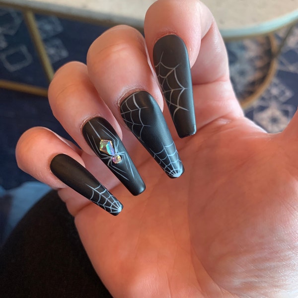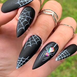 Bling Spider Halloween Nails Matte Black Nails Handpainted White 0