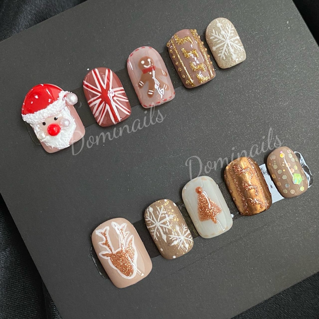 3D Christmas Press on Nails Short Square Red Gold Santa Nails Hand 11