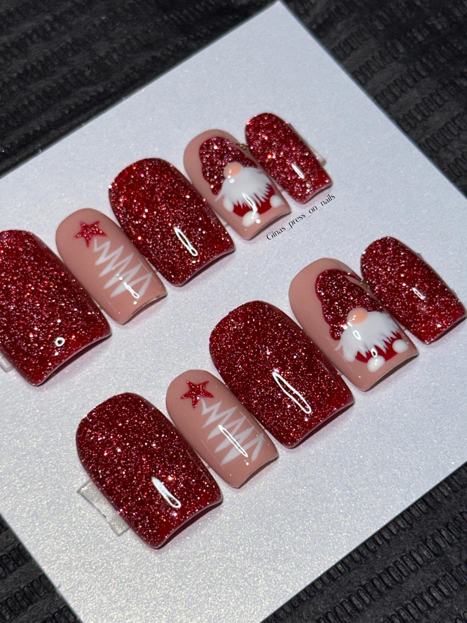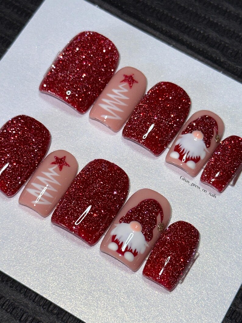 4 cozy Christmas Red Sparkly Gonk gnome Medium Square Nails Custom Hand 12