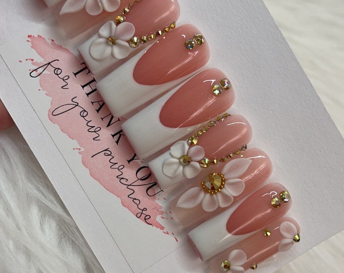 3d Floral French Tip Acrylic Press on Nails Etsy 12