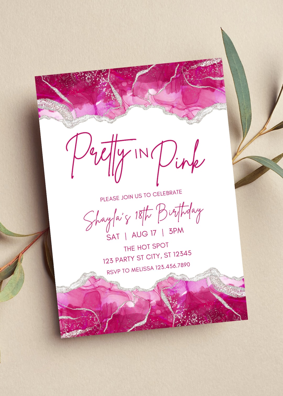Editable Pink Birthday Invitation Pretty in Pink Hot Pink White and 8