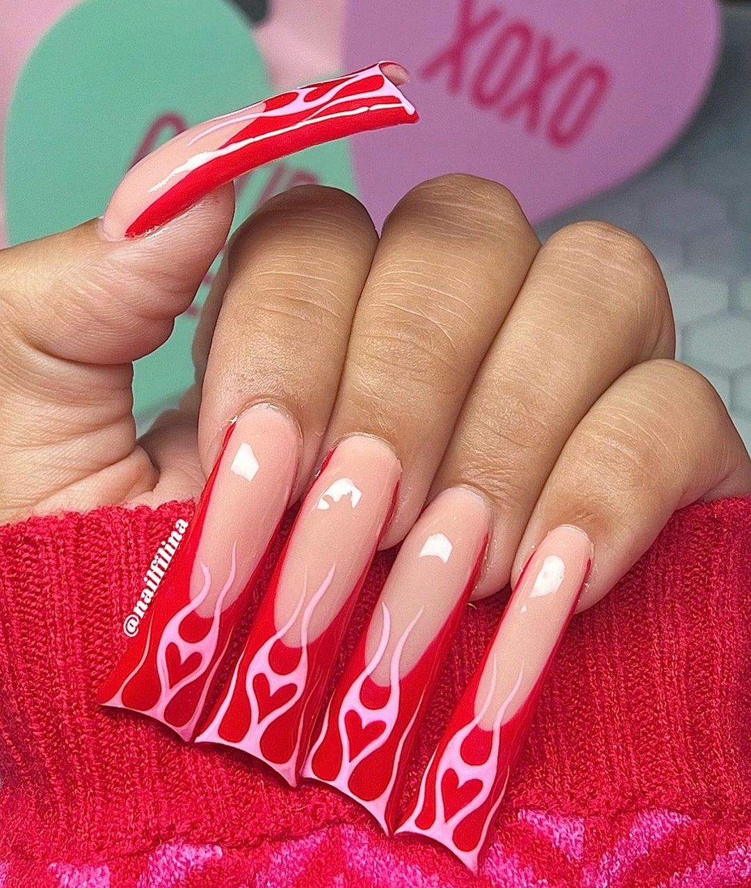 Pink and Red Heart Flame French Tip Flare Nailsbling Nailspink 9