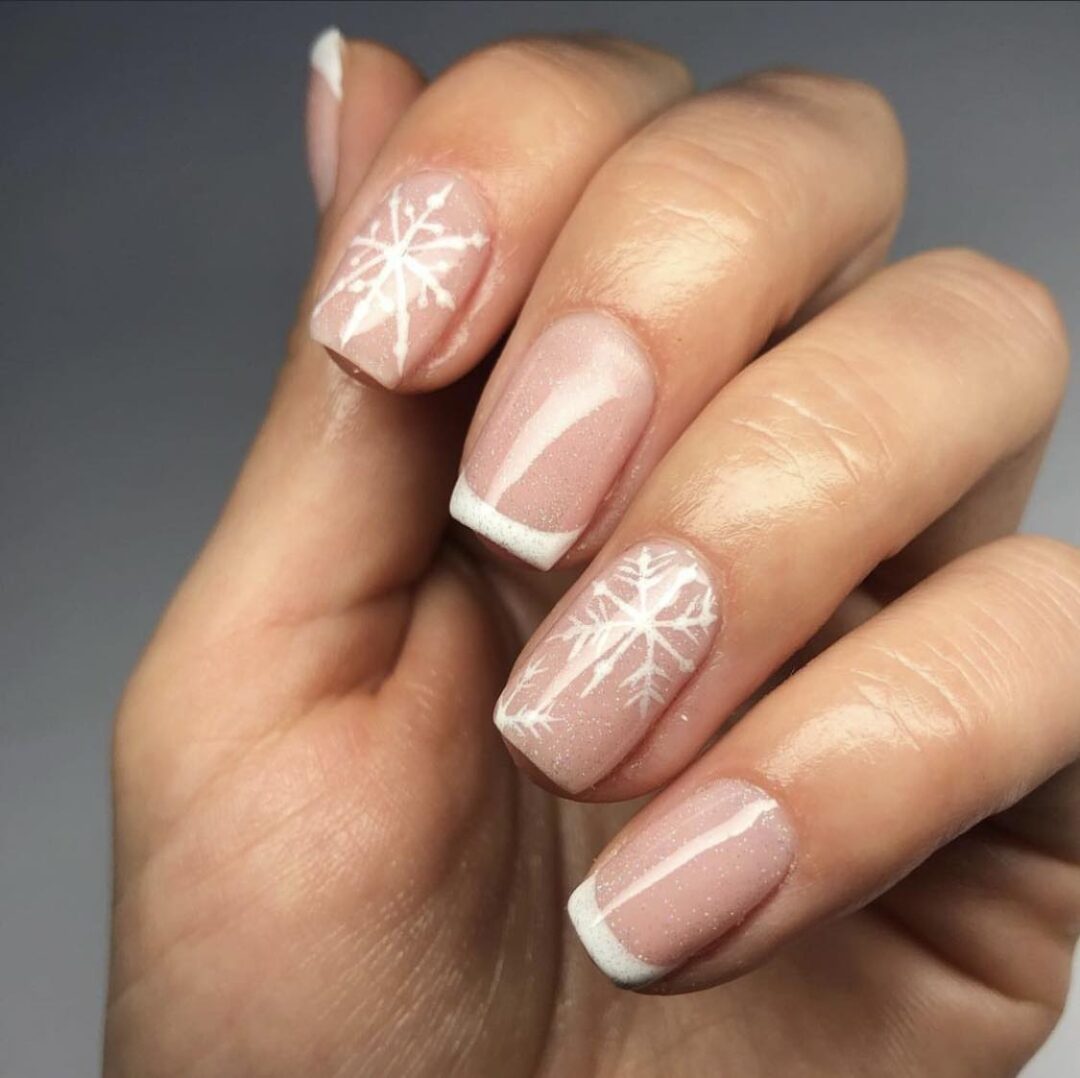 White French nails with snowflakes Christmas snowflakes nails Pink 2
