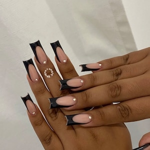 Black French Tip With Rhinestone Press on Nails Black Nails long Nails 5