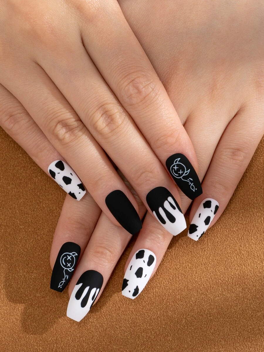 Get Glamorous With 24pcs Short Coffin Black And White Colorblock Devil 13