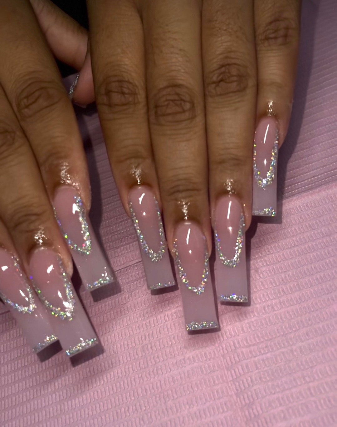 Pink French nails with reflective glitter outline Baby pink nails 2