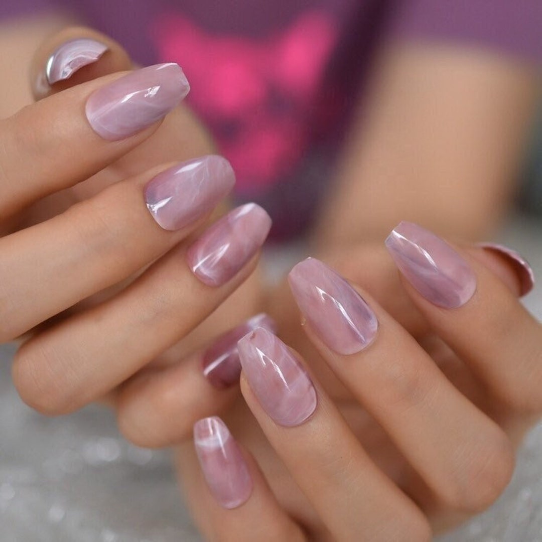 Pink Marble Medium Coffin Press on Nails 24 Pieces Full Kit With 10