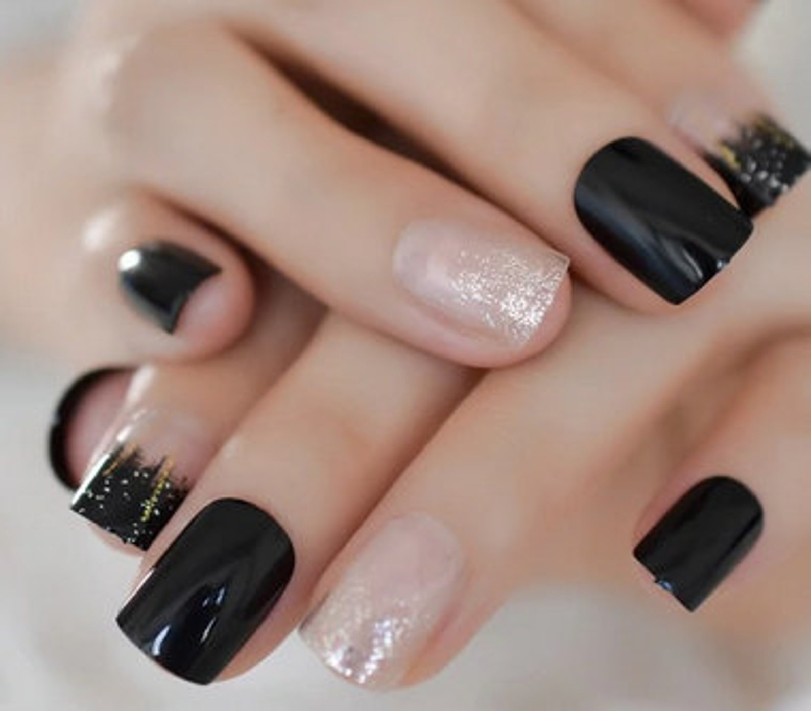 Black Glitter French Tip Short Round Press on Nail Tips 24 Etsy 9